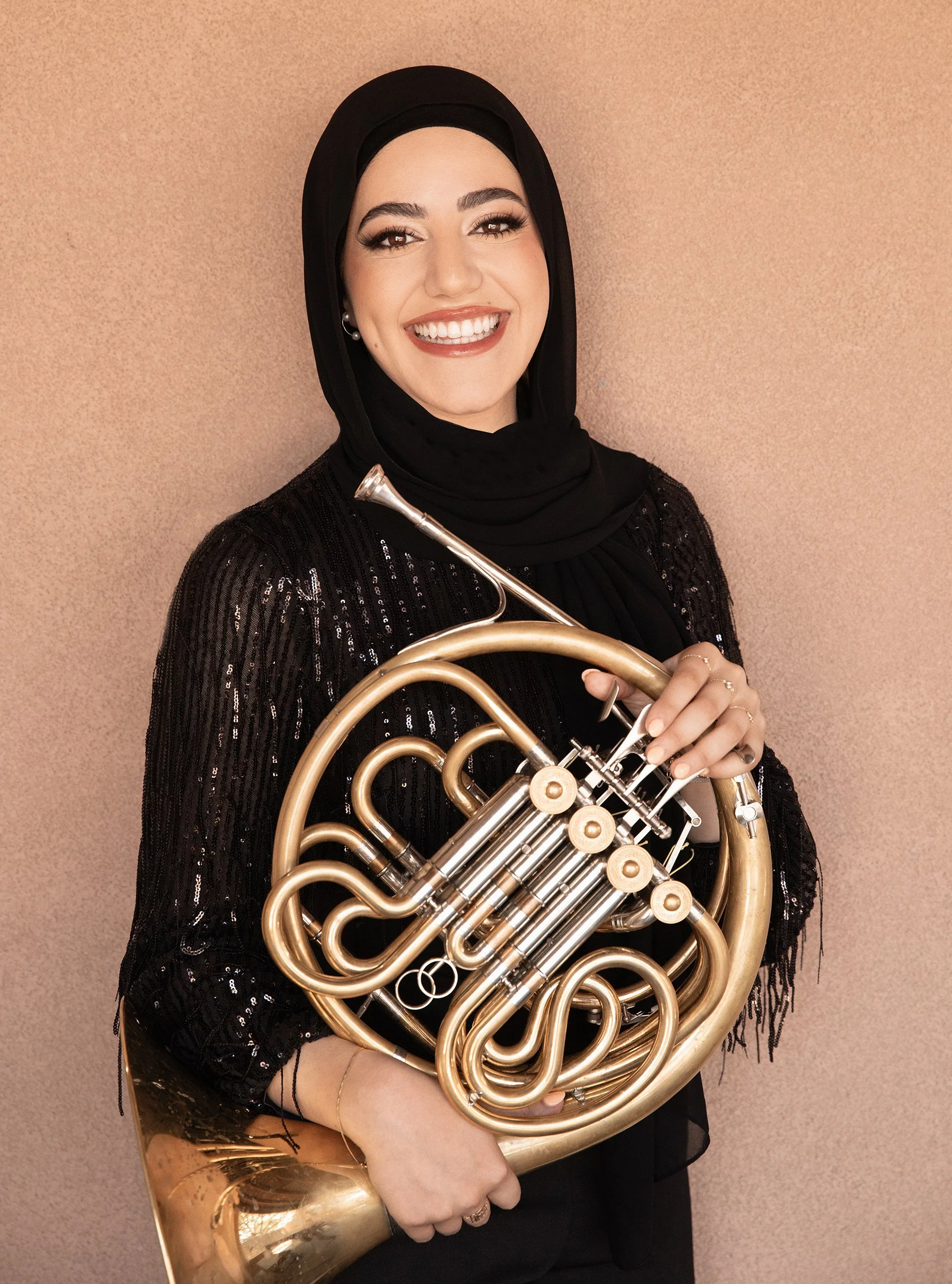 Layan Atieh is a Palestinian-Jordanian-American horn player currently residing in Chicago, Illinois. Layan is a member of Seraph Brass, a world renowned all-women brass quintet, as well the Civic Orchestra of Chicago. As an active freelancer, Layan has performed with the Cleveland Orchestra and the Chicago Symphony Orchestra. She is passionate about chamber music and has performed at festivals around the world, including the Hidden Valley Festival of Winds, Domaine Forget, and the Stellenbosch International Chamber Music Festival, as well as orchestra festivals such as the Music Academy of the West. In 2022, Layan completed her undergraduate studies at the Peabody Institute under the tutelage of Robert Rearden, as well as a Bachelor’s degree in Political Science from Johns Hopkins University. She earned her Master’s degree in 2024 at the Cleveland Institute of Music, where she studied with Richard King and Nathaniel Silberschlag.
